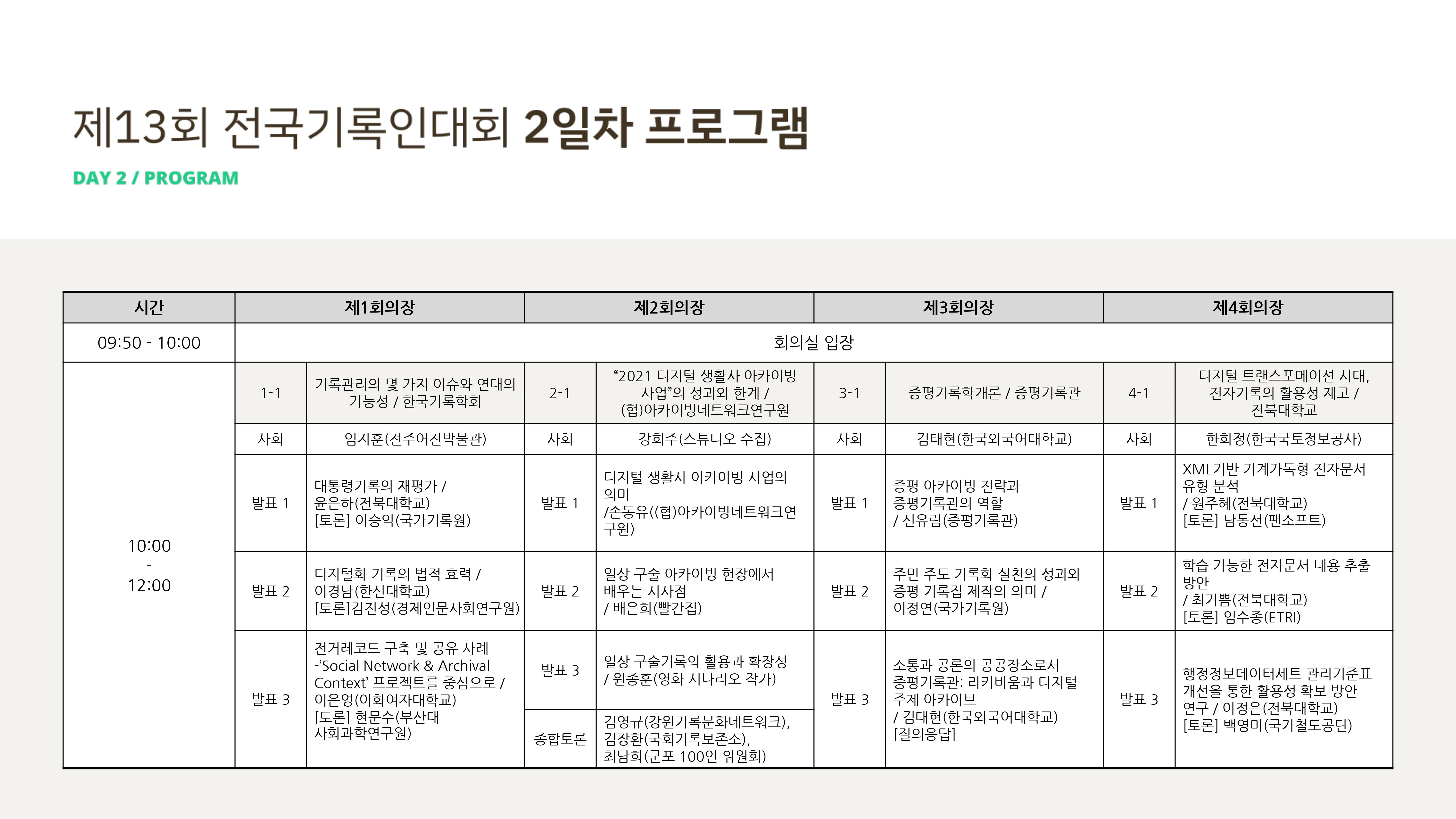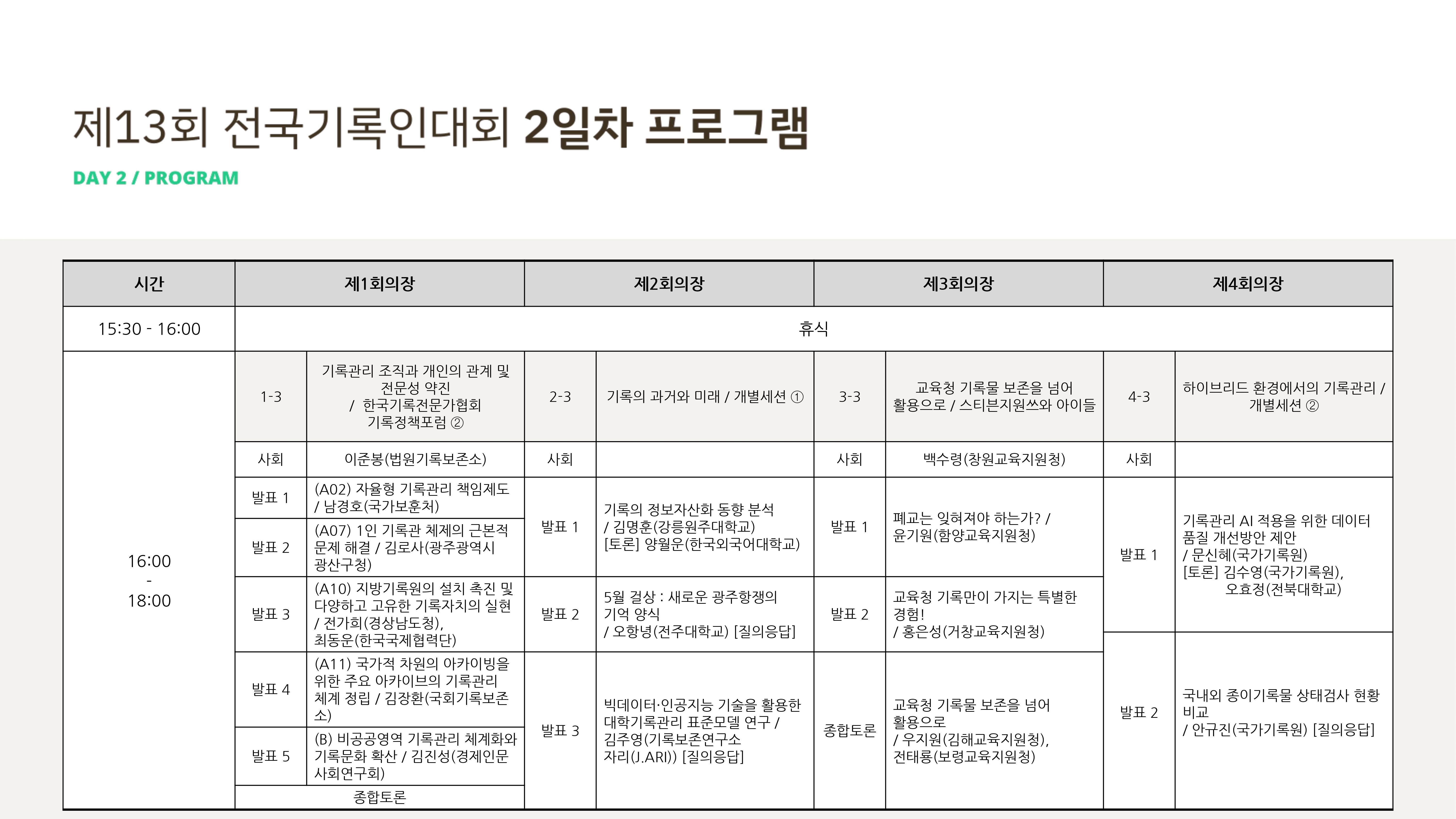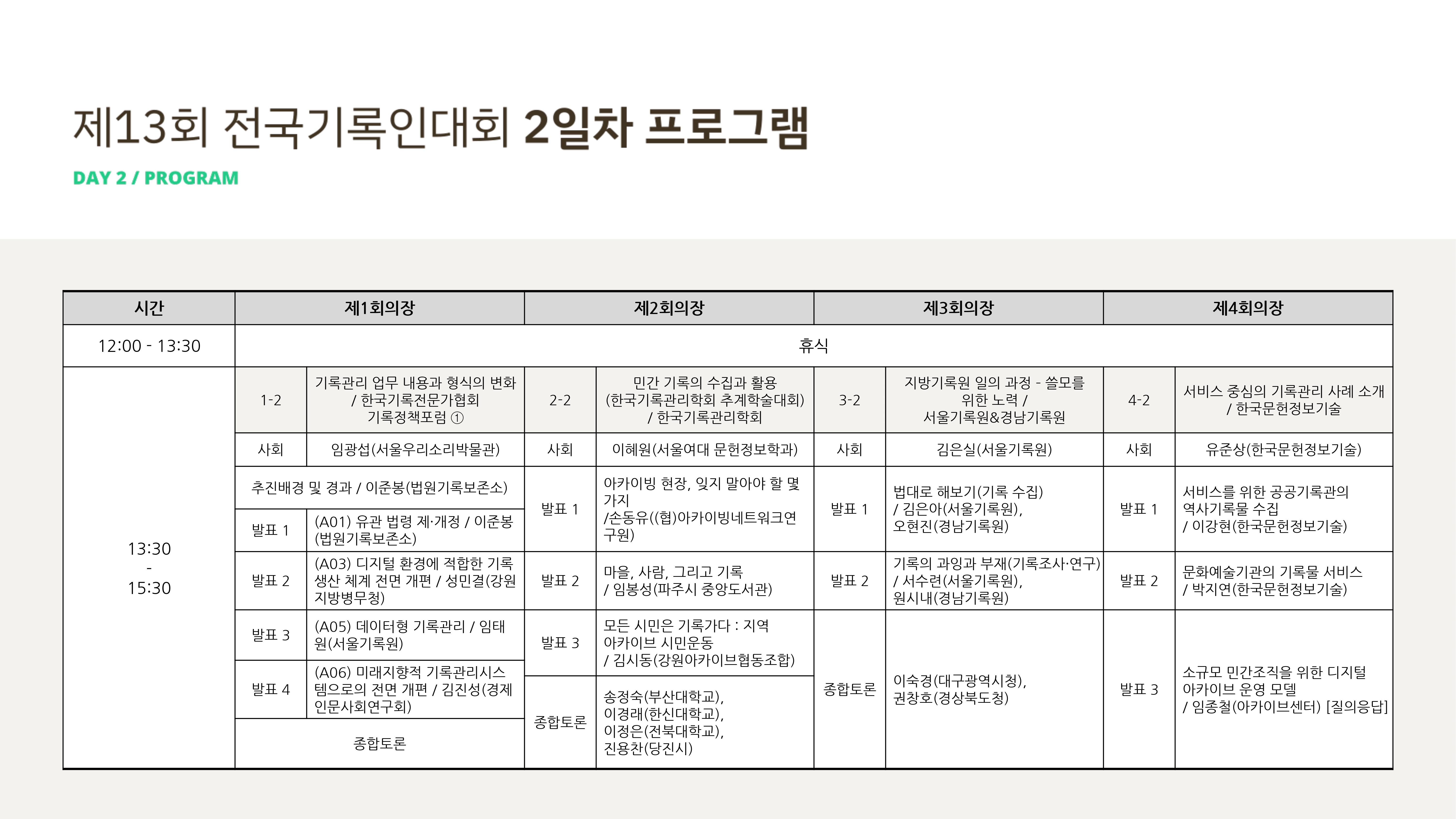 제13회 전국기록인대회의 1일차 및 2일차 일정을 공유하오니 아래 이미지를 참고해주시기 바랍니다.