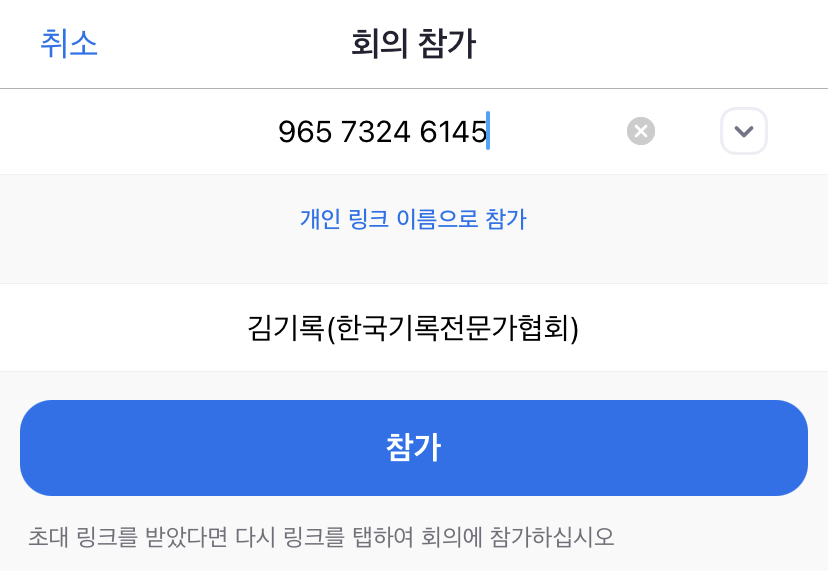 3. ‘회의 ID 또는 개인 링크 이름 입력’ 란에 참가링크 혹은 회의 ID를 입력하고