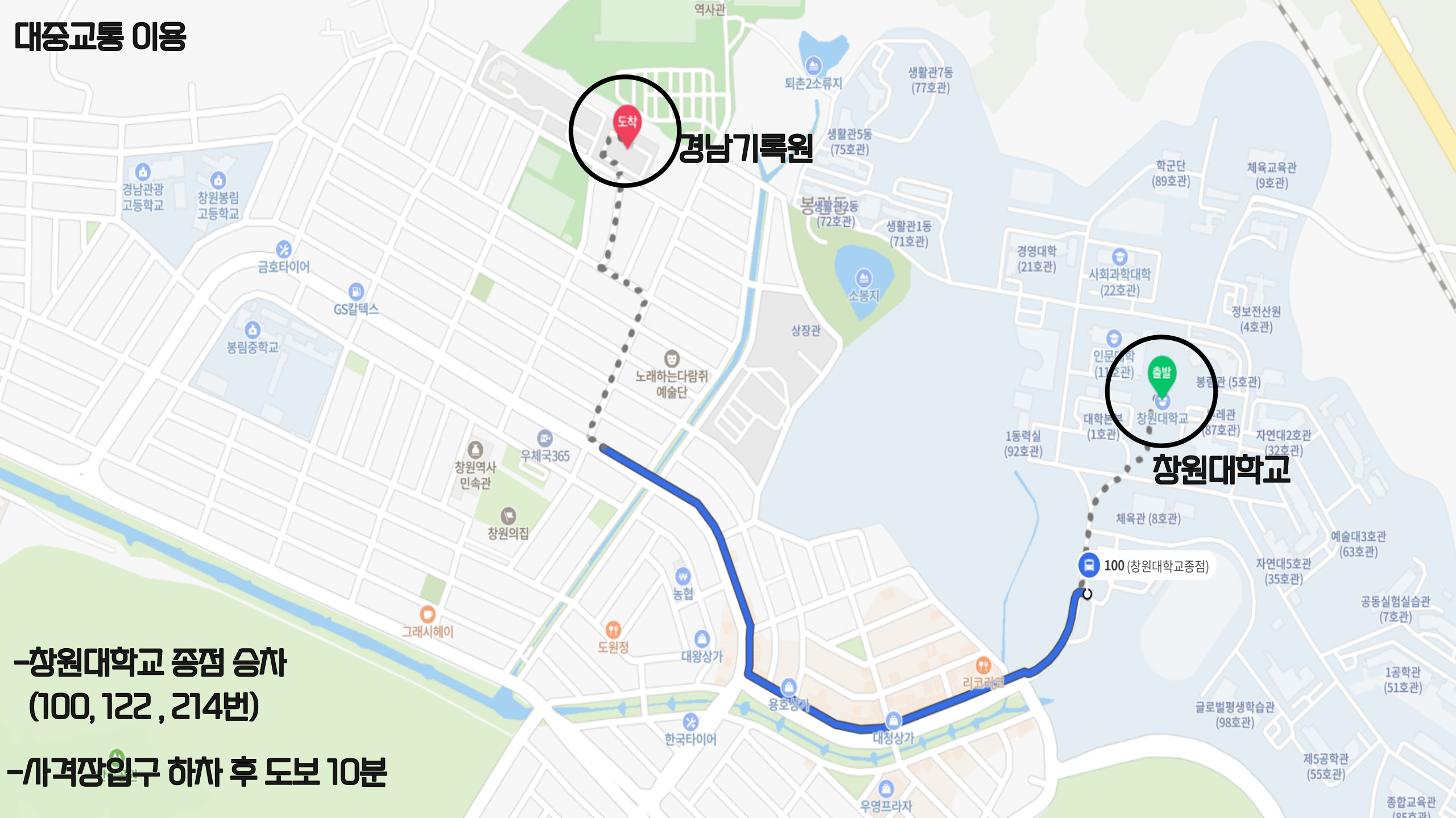 - 창원중앙역 하차 후 버스 이용 시(약 15분 소요): 214번, 156번