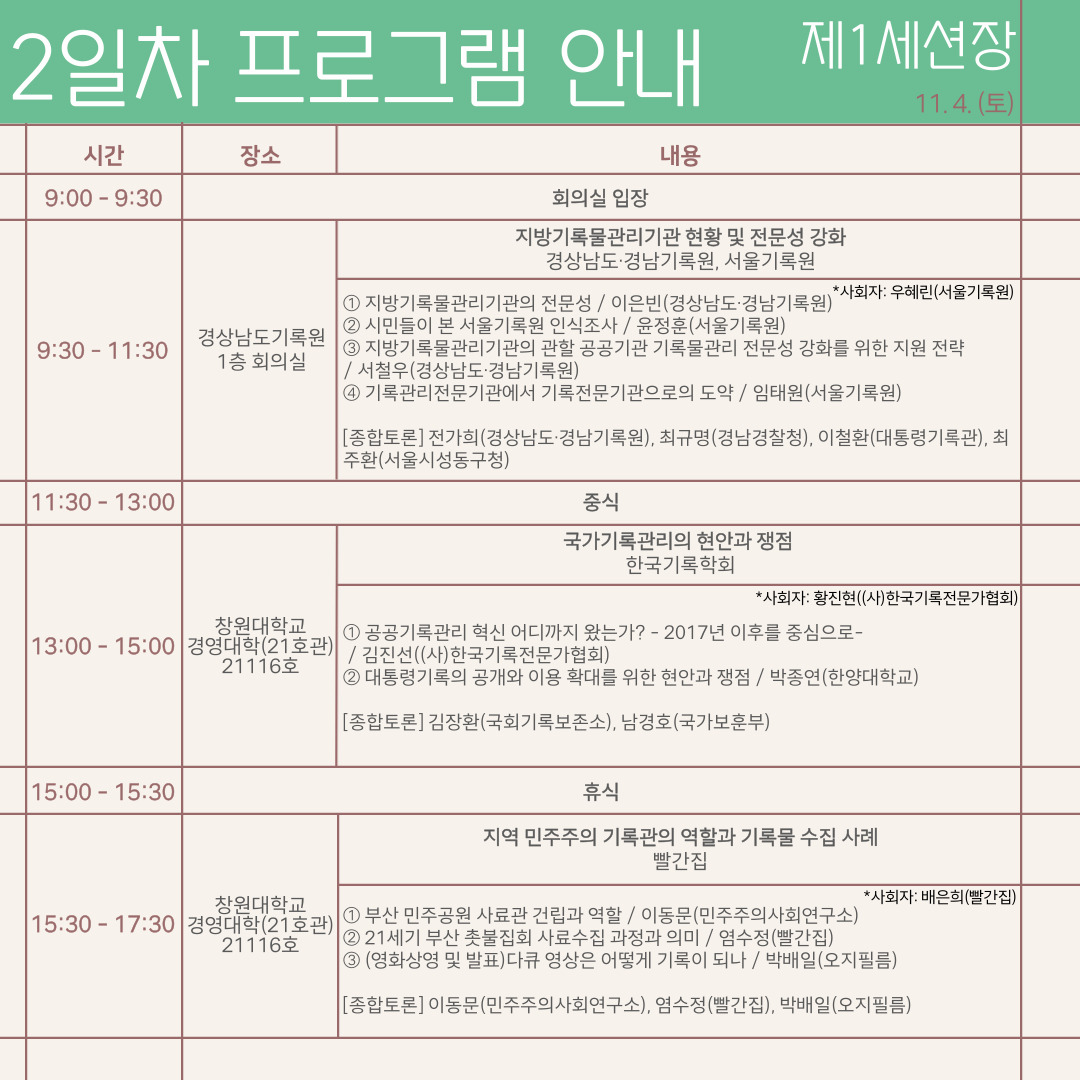 - 2일차: 경상남도기록원 1층 회의실, 창원대학교 경영대학(21호관) 21116호, 21117호, 21225호, 21226호