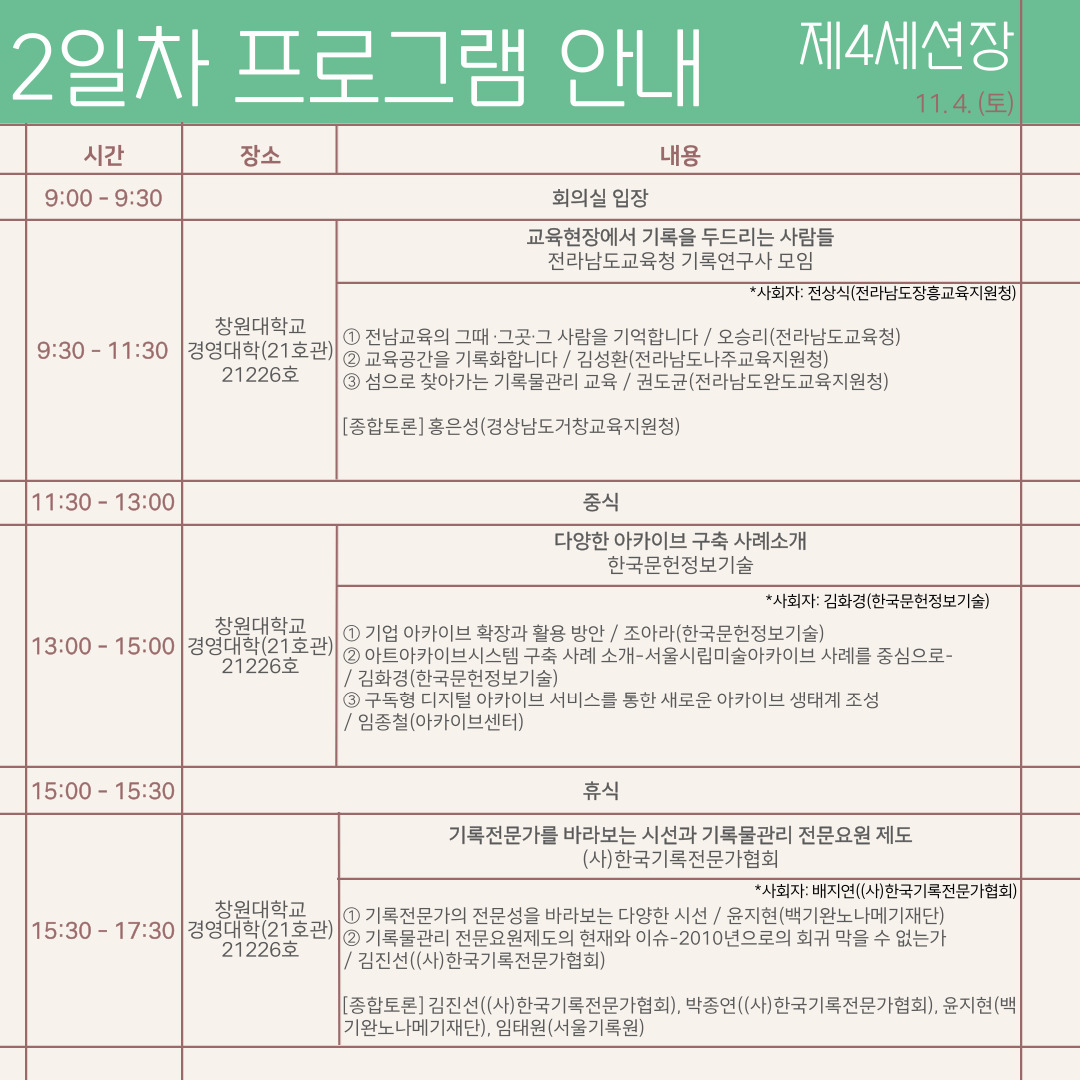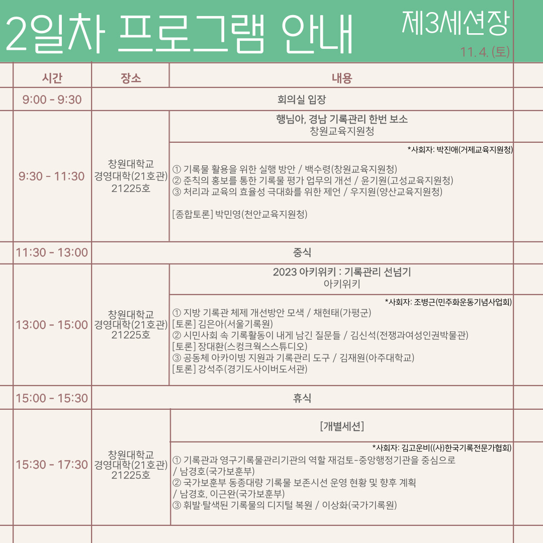 - 2일차: 경상남도기록원 1층 회의실, 창원대학교 경영대학(21호관) 21116호, 21117호, 21225호, 21226호