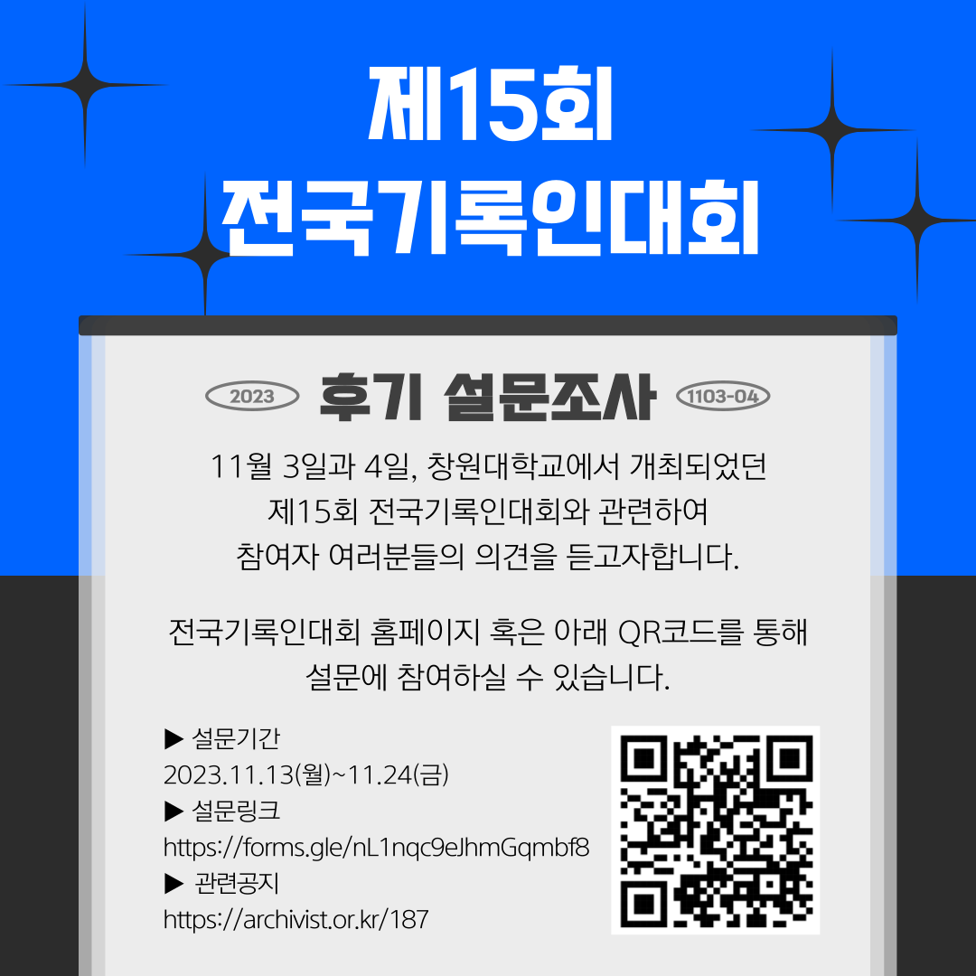 2023년 제15회 전국기록인대회에 참여해 주셔서 감사합니다. 이번 설문 결과를 분석하여 향후 더 나은 프로그램을 제공하고자 몇 가지 설문에 대한 응답을 부탁드립니다. 소중한 의견이 반영될