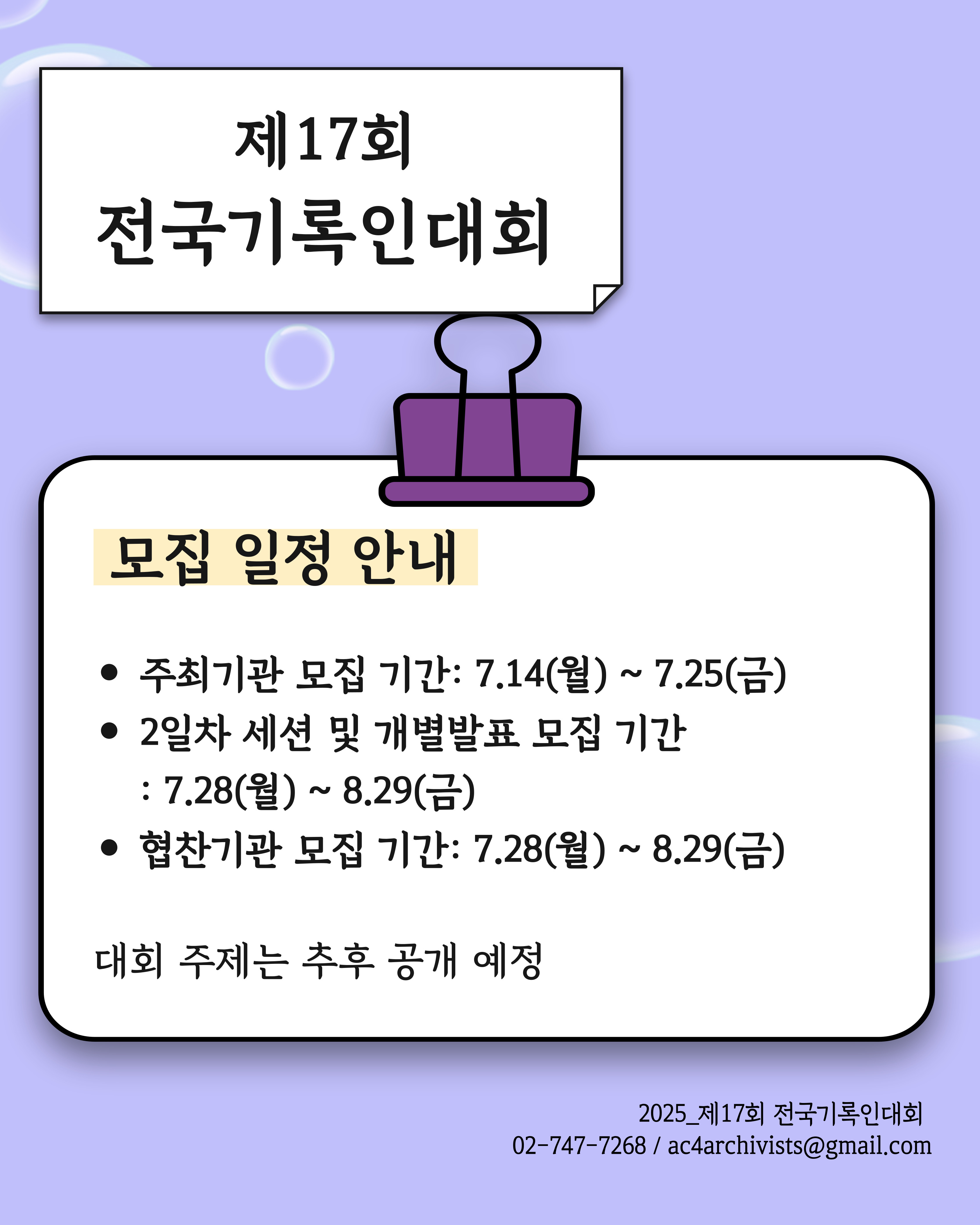 | [공지] 제17회 전국기록인대회 2일차 세션·발표 모집, 협찬기관 모집 D-9 (0) | 2025.08.20 |