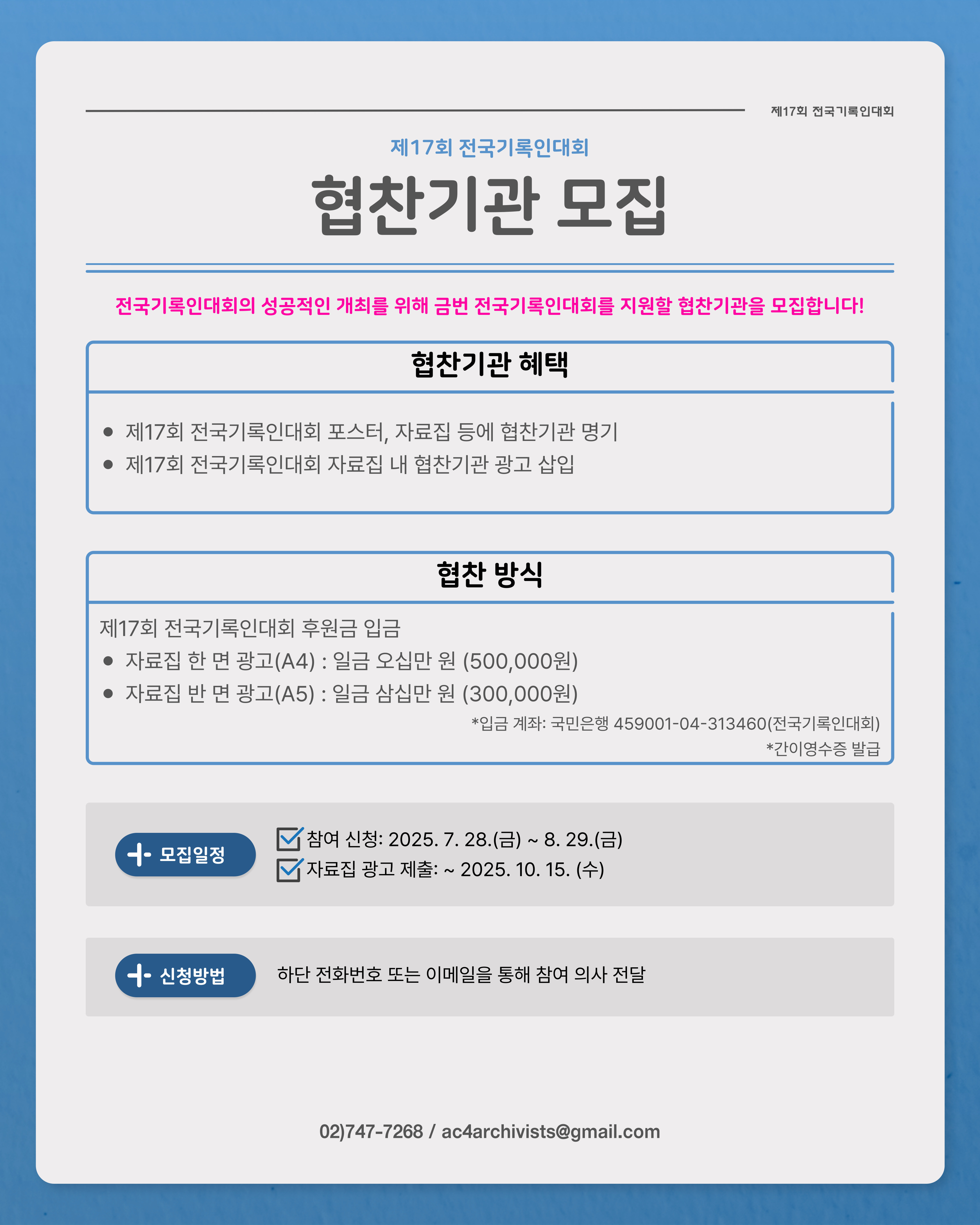 - 전국기록인대회의 성공적인 개최를 위해, 금번 전국기록인대회를 지원할 협찬기관을 모집함