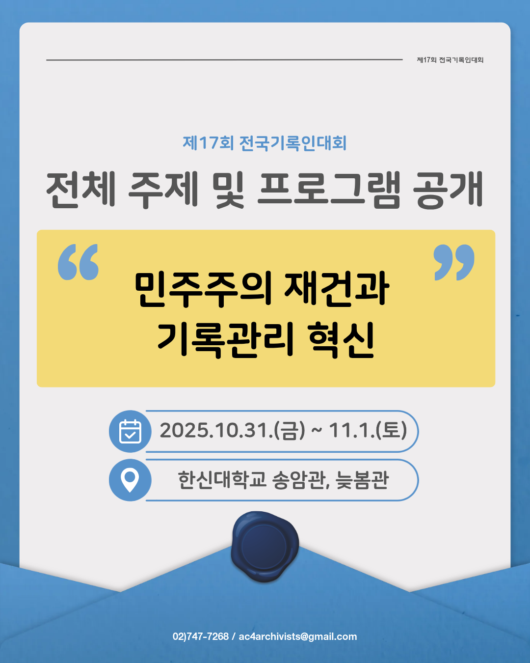 [공지] 제17회 전국기록인대회 2일차 세션·발표 및 협찬기관 모집 일정 안내 (0) | 2025.07.25 |